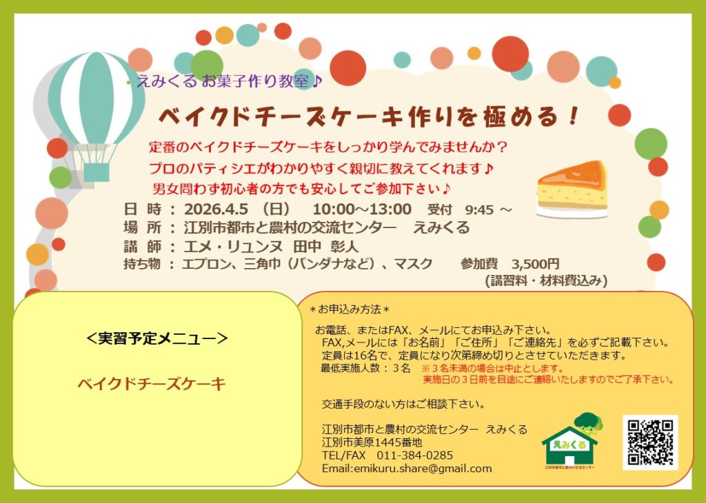 定番のベイクドチーズケーキをしっかり学んでみませんか?プロのパティシエがわかりやすく親切に教えてくれます♪男女問わず初心者の方でも安心してご参加してご参加ください。